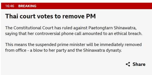 宪法法院这次直接罢免佩通坦,说明以军方为代表的保守派,已经下定决心,踢开他信家族,尝试直接掌控政府。