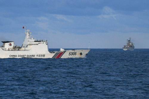 图 | 菲律宾派遣船只擅自闯入中国南沙群岛仁爱礁海域,中国海警依法对菲方船只(右)采取必要措施
