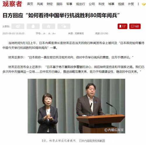 日本这边依旧是“揣着明白装糊涂”。被问及日方如何看待中国举行九三阅兵活动时,日本内阁官房长官林芳正依旧不敢正面回答核心问题,只是表示日方一直在密切关注相关动向,但对中方举行阅兵的意图,他闭口不评论。