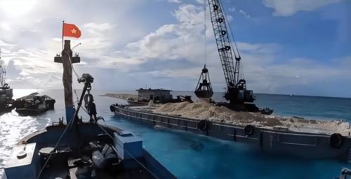 越南在南海的填海行动从2014年小规模起步,到2021年进入新阶段,引入切割吸泥船加速进程。船队从河内港口出发,载着重型机械穿越海域,抵达斯普拉特利群岛的礁盘。2021年10月,工人们在巴克加拿大礁卸下设备,切割吸泥船的刀头旋转着钻入海底,吸起沙土通过管道喷射到礁面。海水翻腾,泥沙混合物一层层堆积,工人们用铁锹平整表面,避免积水。巡逻艇在周边水域盘旋,警戒船只接近。