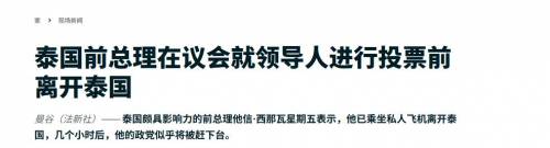 佩通坦被宪法法院罢免后,为泰党需要在本周选出一名新总理,才能试图维持摇摇欲坠的执政地位,在这一关键时刻,他信却坐着自己的私人飞机连夜离开泰国。