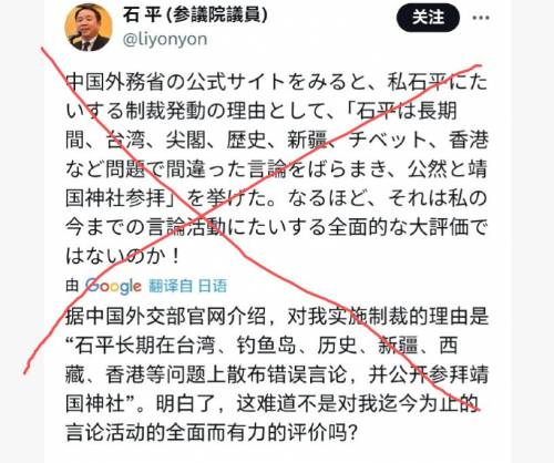 外交部点名指出,石平太郎长期在台湾、钓鱼岛、涉疆、涉藏、涉港等重大问题上撒布谬论,并且公然参拜靖国神社,严重违反中日之间的政治文件精神和一个中国原则。