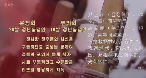 纪录片里讲了几个朝鲜士兵的故事:20岁的尹正赫和19岁的禹伟赫被敌人包围时,抱在一起拉响手榴弹;