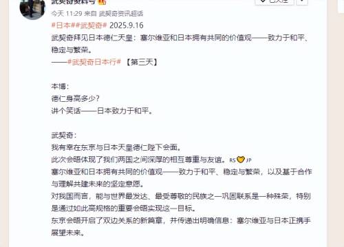 据悉武契奇这次访问日本是从9月14日到17日,大概四天的时间,在9月16日的时候,武契奇还和日本德仁天皇见面了,从画面中我们可以看出,武契奇1米9的身高和1米65的德仁天皇形成了鲜明的对比。而武契奇还是很懂日本的礼节,等他从车内出来,看到德仁天皇的时候还弯腰低头行礼。