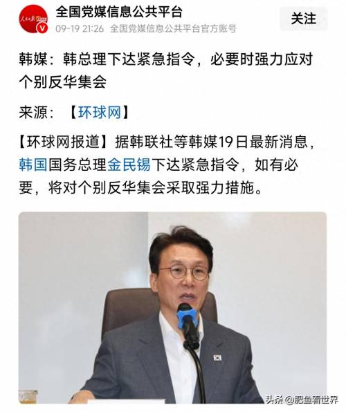 韩国总理金民锡在9月19日发布紧急指令,要求对反华组织的游行进行强力措施。