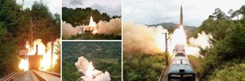 2021年朝鲜从铁路系统进行导弹测试时,朝鲜官方媒体发布的一组照片。朝鲜官方媒体
