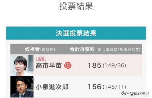 之前就知道部分岸田派的自民党和麻生就宣告支持高市了,而这次她以185票的优势击败小小泉的156票也不意外。自石破之后,剩余的自民党潜龙中只有高市有这个能在当前情况下被党内各方大佬默认,如果今年7月的参议院选举中参政党没有崛起的话,可能高市未必会有如此优势,可惜没有如果。