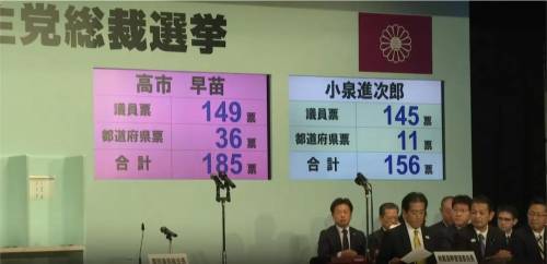 以185票对156票的优势击败小泉进次郎,成为自民党首位女总裁,并有望成为日本首位女首相。
