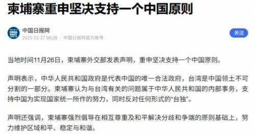 柬埔寨直接表态支持中国统一努力,相当于默许中方军事行动。