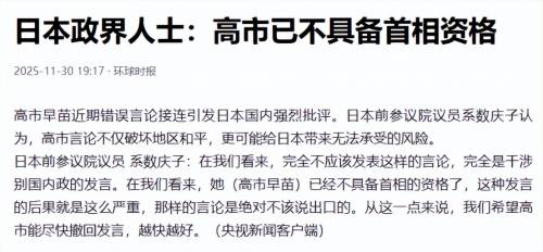 经贸领域的反应不仅于此,还暂停日本水产品进口,取消多项中日民间交流活动,收紧赴日旅游签证等等,精准打击了日方经济敏感领域。日本经济界已经感受到压力。系数庆子指出,日本高度依赖中国,现在后果很严重,她已经不具备首相资格,这些经济压力正转化为政治压力,迫使高市早苗重新考量其立场。