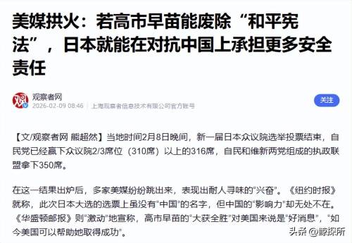美媒更是直接拱火高市胜选对美国是好消息,还明目张胆地说如果日本能废除和平宪法,就能承担更多安全责任。