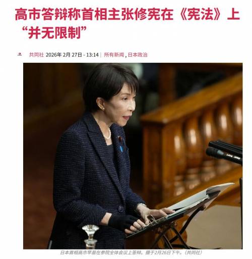 2月26日,面对立宪民主党议员斋藤嘉隆关于《宪法》第99条(公职人员须尊重拥护宪法)的质询,高市直接回应:“首相讨论或主张修宪,在宪法上并未受到限制。”