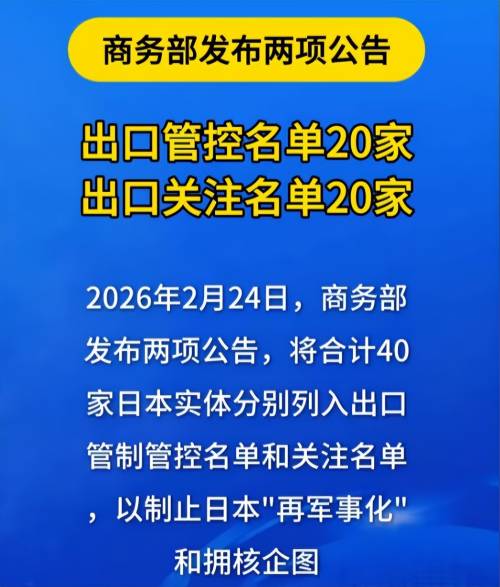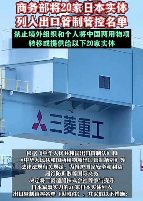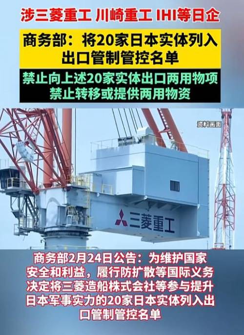 2月24日中国商务部官网同时发布两份公告,第一份是将三菱造船等20家日本实体列入出口管制管控名单。