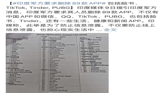 如今印度不仅是想要与华闹到“势不两立”的地步,更是要将本国置于被全球孤立的境地,在要求删除中方59款APP,抵制“中国制造”之后,当地时间9日,印度军方又要求其人员删除89款APP,这其中不仅包括中国APP如微信,QQ,TikTok等,还包括脸书,Tinder....印媒表示,此举是为了防止信息泄露,不仅要防止线上信息泄露,也担心现实生活中的信息打探。看来,印度是要重走大清“闭关锁国”政策,彻底将国家封闭起来了。