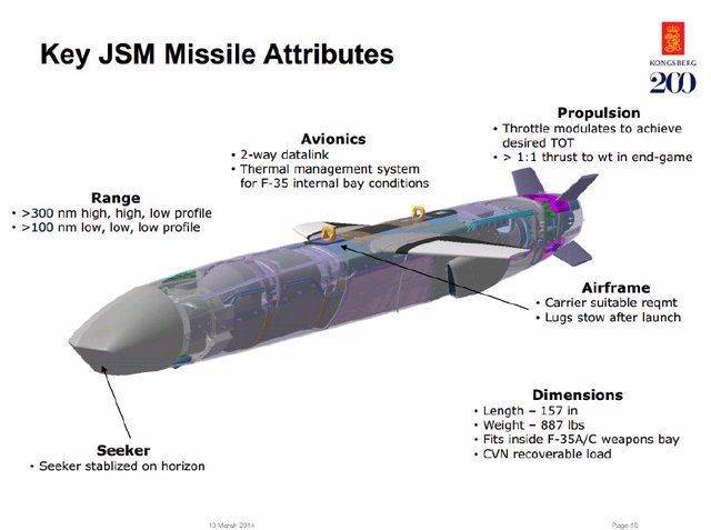 据悉,日本防卫省目前考虑购买的是可用于F-35内置弹仓、美国和挪威联合研制的JSM“联合打击导弹”,另外,自卫队还有可能采购可用于F-15J的美国洛马公司的 “远程反舰导弹”、或者 “联合空对面防区外导弹”。JSM导弹堪称一种完美的防区外空对面导弹武器,能塞进隐身战斗机的弹仓,射程足够远,打击目标灵活,采用被动制导,不但气动外形隐身,还完全不主动发出无线电信号。采用高-高-低剖线的JSM导弹,最大射程可以超过550公里。考虑JSM的小身板,这是一个非常厉害的指标。