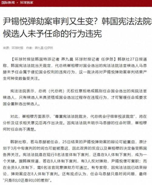 韩媒认为,如果马恩赫的任命通过,韩国宪法法院可能要再举行一场尹锡悦弹劾案的公开辩论。