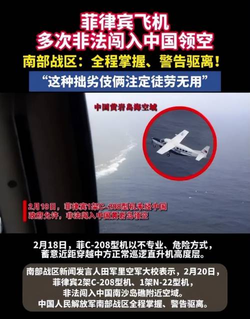 今年2月18日和20日,菲律宾两次出动搭乘有美联社、法新社等西方媒体记者的飞机,非法闯入我国南海领空,进行摆拍碰瓷。