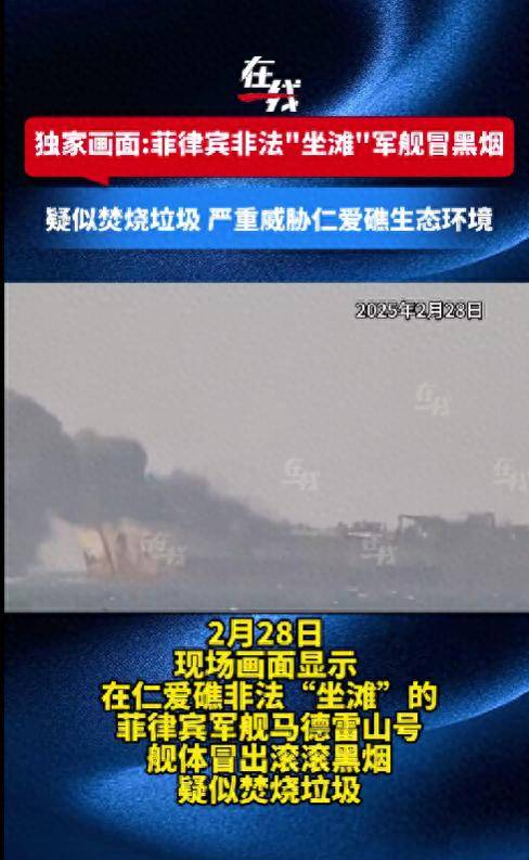 “菲律宾海军非法在仁爱礁坐滩的登陆舰,疑似在放火焚烧物品,严重威胁仁爱礁附近海域的生态环境。”根据国内媒体最新的报道,在仁爱礁非法“坐滩”的菲律宾海军登陆舰,马德雷山号冒出浓烟,疑似在焚烧物品,严重威胁仁爱礁附近海域的生态环境。