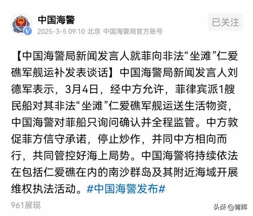 3月5号当天上午,我国海警对外发布消息,指出,3月4号经过我国的允许,菲律宾方面派遣了一艘民用船只,对菲律宾非法坐滩在仁爱礁的军舰运送了生活物资。中国海警对于菲律宾的船只询问确认,并且全程监管,敦促菲律宾信守承诺停止炒作,并向中方相向而行,共同管控好海上局势。我们的海警将依法持续在仁爱礁内的南沙群岛及其附近海域开展维权执法活动。