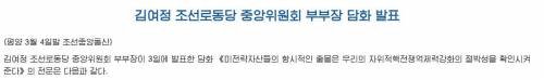 朝鲜劳动党中央委员会副部长金与正不久前发表讲话,谴责美国航母“卡尔·文森”号进入韩国釜山海军基地,无视朝方的安全关切。
