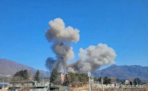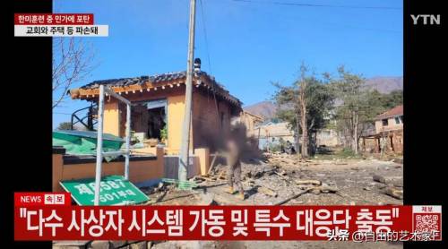 根据韩联社发布的图片,我们看到该地区冒了浓浓的黑烟,有两处民宅已经被炸的剩下框架