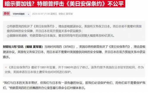 话里话外就透露着两个字,那就是日本打钱。而且对于日本来说,这就是一个紧箍咒了,因为只要美日安保条约在,美国就可以对日本提出各种要求,日本敢拒绝吗?