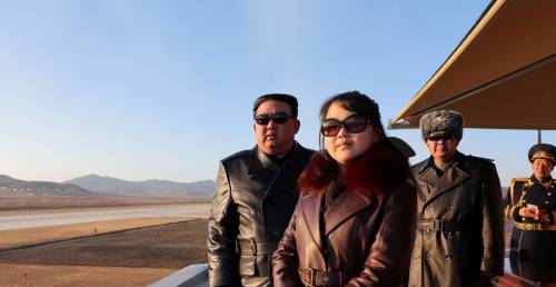 照片中,金正恩身穿黑色羽绒服,手牵着一个穿深蓝毛呢大衣的小女孩,身后是刚发射成功的“火星-17”洲际弹道导弹。