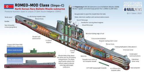 围绕着这艘朝中社报道里提到的战略导弹核潜艇身上的谜团还有更多,咱们就简单说几个好了: