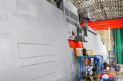 咱们还是先看看这艘朝鲜的“盾舰”吧,从去年年底朝鲜中央电视台公开的画面看,朝鲜领导人金正恩在2024年,起码去过两次新浦造船厂,视察该舰的建造情况。