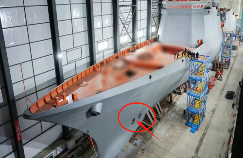 其次是该舰的左舷部分,靠近球鼻艏的位置被发现出现了两个出水孔,看起来怪模怪样的。因为这里不可能安装船舶辅机,不可能从这里进行水下排气/排水,且靠近球鼻艏位置,甚至不排除这里安装有船舶侧推,给驱逐舰安装船舶侧推,这种设计不是没有,只是少见,比如在咱们的水面主战舰艇上几乎没有这种设计。
