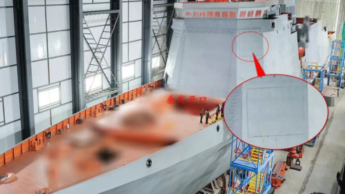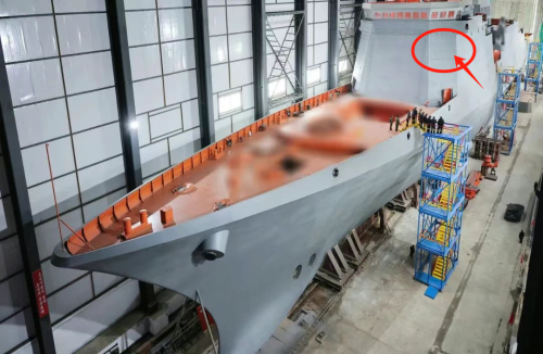 首先是位于舰桥上的相控阵雷达安装位置已经被封闭上了。当然,这并不意味着相控阵雷达已经装舰。毕竟作为安装精度要求极高的舰载设备,相控阵雷达一般需要等待舰体下水之后,在水中进行充分的应力释放后,才能开始安装。现在只是暂时用一块蒙皮把相控阵雷达安装部位掩盖起来,以避免其后台已经安装的伺服系统等受水汽、盐雾等影响。这也是该舰距离下水更近一步的一个特征。