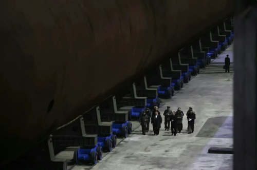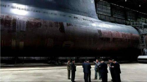 除了检查该型防空舰的建造,朝中社特别提出,朝鲜领导人金正恩随后还检查了朝鲜核动力战略导弹潜艇的建造工作,甚至还专门配了一张新闻图片。图片中,金正恩正走过一段室内船台,而在他和随同的工作人员背后,则是一条“大黑鱼”,可以清楚地看到潜艇的圆柱状艇体。