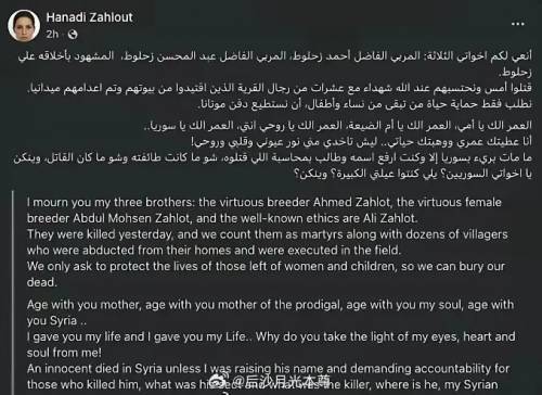 3月8日,叙利亚著名的阿萨德政府反对派活动人士哈娜迪·扎赫卢特在网络平台发文,声称自己的三名兄弟姐妹昨天都遭到杀害。