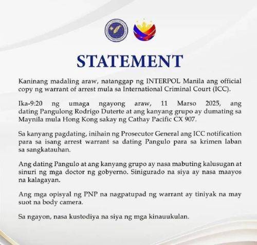 随后,菲律宾总统办公室发表声明:“今天上午,国际刑警组织马尼拉办事处收到了国际刑事法院(ICC)发出的逮捕令的正式副本……目前,他已被当局拘捕。”