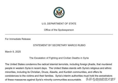 接连三天对平民的清洗让美国人也看不下去了,美国务院在3月9日发声谴责了,HTS对阿拉维派和基督徒的屠杀行为。美国务卿卢比奥发表讲话,称美国和叙利亚境内的基督教徒、德鲁兹派、阿拉维派以及库尔德人站在一起,强烈谴责对平民的屠杀行为,要求朱拉尼追究屠杀者的责任。