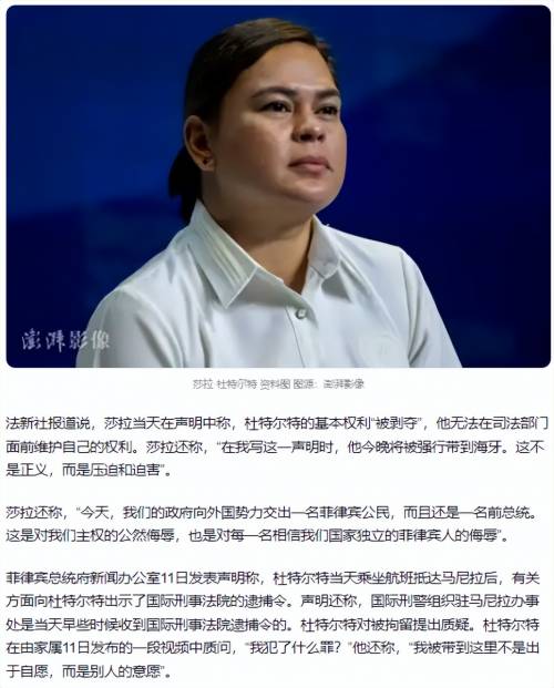 对此,杜特尔特之女、身为副总统的莎拉,在其父被抓当日就径直发表声明,对小马的罪行予以指责。