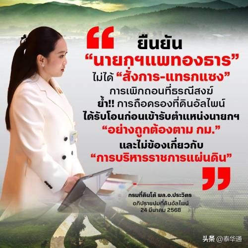 另外,在佩通坦总理回应质疑后不久,泰国内政部土地厅就发布了官方文件,就巴逸上将提到的干预土地案进行回应。文件指出,佩通坦总理在上任前就合法从前任股东处收购了公司股份,与政府行为无关。且佩通坦总理在上任后没有干预过巴逸上将提到的土地所属权问题,一切行为合法合规,不存在任何不正当利益。