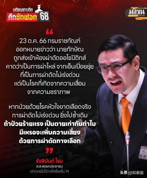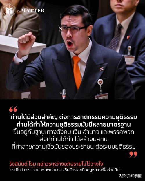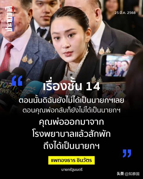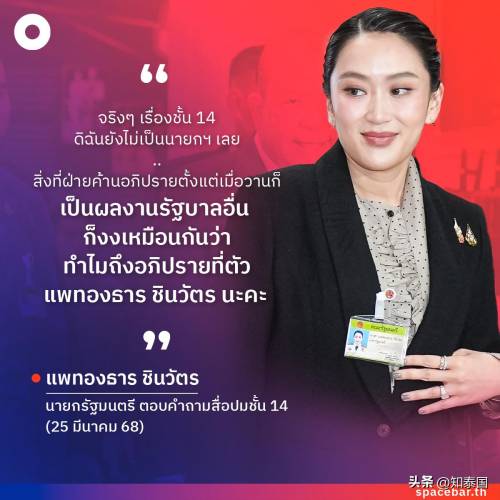 据泰叻报最新报道,3月25日是泰国不信任动议辩论会第二天,当天上午,作为泰国反对派领袖的人民党议员朗诗曼在议会上就“14楼”一事对佩通坦总理开展严厉批评,直言其不配做总理,要求她赶紧下台。