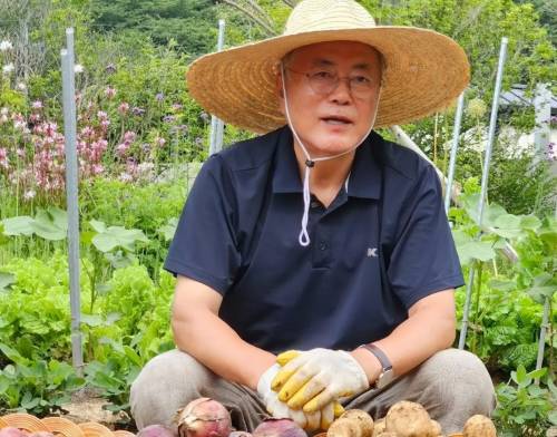 【镜头前的文在寅以一副农人装扮示人,胡子拉碴,少修边幅】