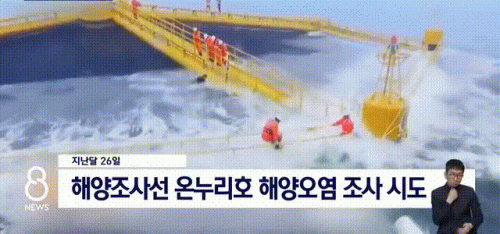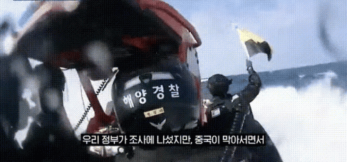 韩国人的船只来的时候,中国的大型工程船正在对这三座巨型海上建筑物进行施工。这些韩国的船只达到附近并试图冲过去的时候,正在附近巡逻的中国海警船赶了过来,立即把韩国的船只截停了下来。