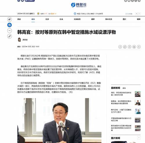2月26日,韩国政府突然派遣海洋水产部旗下海洋科学技术院的调查船,前往暂定措施水域对中国设置的钢结构进行考察。这一举动事出突然,遭到了中方的阻止,这一新闻拖到3月中才对外公布,与中日韩外长会时间节点高度重合。而且3月26日,韩国海洋水产部长官康徒衡表示,按照对等原则,韩国政府在该水域设置了大型漂浮物。