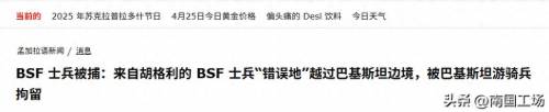 当地时间2025年4月25日,巴基斯坦军方宣布,巴基斯坦“游骑兵”特种兵部队,成功在巴基斯坦旁遮普省,俘虏了一名非法侵入巴基斯坦领土的,印度边境安全武装部队士兵,姓名p. K.辛格,据称这名印度士兵配备了英萨斯突击步枪。对此,印度方面紧急进行了解释。