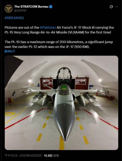 4月26日,美国战略司令部在X社交网站发布一张巴基斯坦空军JF17“枭龙”BLOCK3战机挂载霹雳15空空导弹的图片,这是巴基斯坦有意公开的。但又是美国战略司令部在社交网站发布,这说明巴基斯坦的JF17“枭龙”BLOCK3战机已经具备发射霹雳15的能力,并告诉印度不要轻举妄动。
