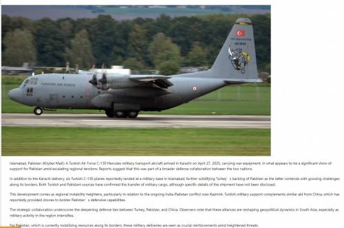 当地时间4月28日,巴基斯坦《开伯尔邮报》就发表一篇题为《土耳其向巴基斯坦运送军事物资,应对地区紧张局势》的文章称,2025年4月27日,一架土耳其空军C130 “大力神”运输机抵达巴基斯坦卡拉奇。除了卡拉奇以外,还有6架土耳其的C130“大力神”运输机降落在伊斯兰堡的一个军事基地,也就是说土耳其至少向巴基斯坦派出了7架次的C130“大力神”运输机。