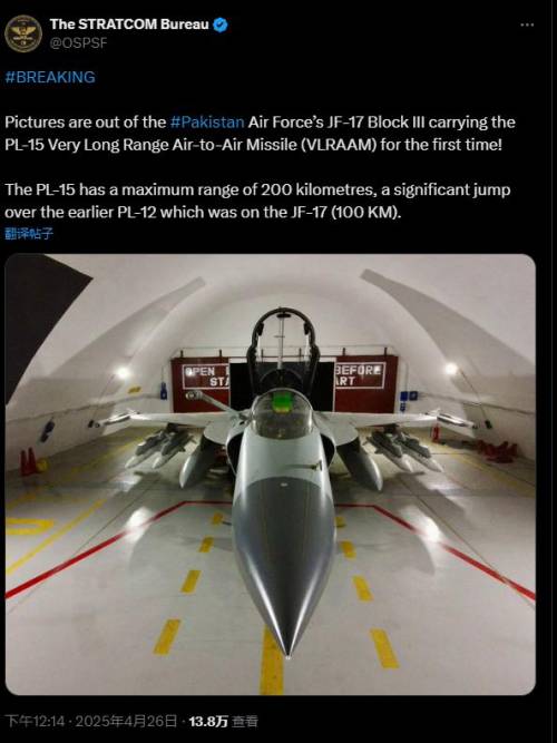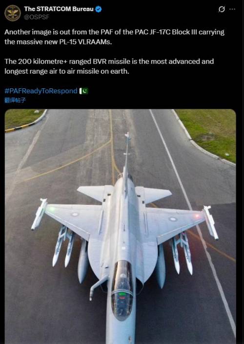 在此次印巴局势升级之际,巴基斯坦战略司令部突然在X社交网站发布的一张JF17“枭龙”BLOCK3战机挂载霹雳15空空导弹的图片,旨在告诉印度我们手中有的是先进武器,且JF17“枭龙”BLOCK3战机已经具备发射霹雳15的能力,我们不只是J-10C和F16能够与印度阵风和苏30对抗,JF17“枭龙”战机也具备这样的能力。