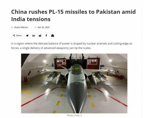 在巴基斯坦亮出JF17“枭龙”BLOCK3战机挂载霹雳15空空导弹的图片不久,保加利亚《Bulgarian Military》防务网站在4月26日就发表一篇题为《中国向巴基斯坦紧急运送pL-15导弹,以应对印度紧张局势》的文章称,在印巴局势升级之际,中国紧急向巴基斯坦运送了霹雳15空空导弹,且这些导弹是从中国空军的库存中调取出来的,还不是外贸版本,以此来帮助巴基斯坦应对当前的紧张局势。
