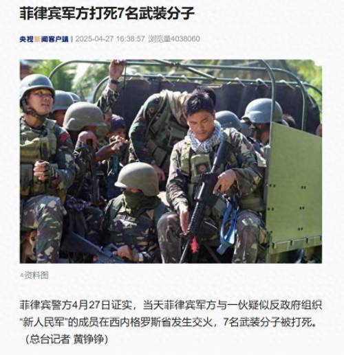 昨天下午四点,央视新闻发布了这样一个消息。菲律宾政府军在这里和NAp的部队爆发了遭遇战。根据菲律宾媒体报道,首轮交火持续约10分钟,随后追击部队在1公里外再次与7名武装分子交火5分钟。最终确认7名新人民军成员被击毙,军方未公布自身伤亡情况。不过考虑到此前菲律宾军队打NAp的战绩,我只能说估计死了不少人。