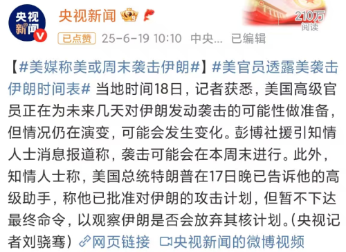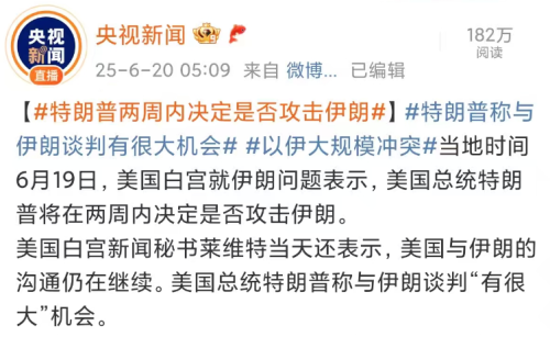当地时间18日,众多美国消息来源都表示,美国总统特朗普已经批准了对伊朗的攻击计划,但“暂不下达最终命令”,希望伊朗在高压之下主动放弃核计划。6月19日,虽然伊朗已经反复表示不会进行谈判,但特朗普又表示会在“两周内决定是否攻击伊朗”,但仍然认为“有很大机会与伊朗谈判”。