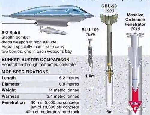 GBU-57钻地炸弹装填有超过2400公斤高能炸药,也是目前世界上最大的常规炸弹,具备极为强大的威力。按照一般的说法,GBU-57能穿透足足60米的钢筋混凝土,远远超过此前的同类武器。