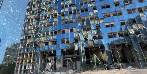 19日,特拉维夫证券交易所周边遭袭后,大楼外墙损毁严重